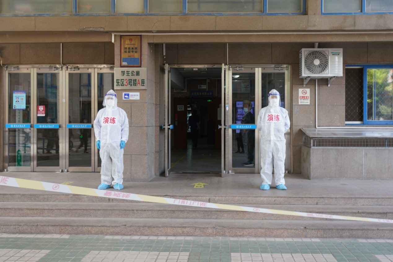 為有效應對當前嚴峻復雜的新冠肺炎疫情形勢,進一步完善應急處置流程,提升應急處置能力,按照北京市的相關要求,在學校疫情防控應急封閉管理工作組的統一指揮下,4月26日上午,學校在阜成路校區開展校園突發疫情全要素、全流程、多場景實戰應急演練。海淀區衛健委副主任鄭洋、甘家口街道辦事處副主任崔瑋、區生態環境局土壤和固廢科副科長王修花、甘家口派出所社區民警王高波,我校校領導黃先開、孫寶國、李中奇、鄭文紅,以及各專班成員單位負責人參加演練。李中奇、鄭文紅擔任總指揮,學校辦公室主任王曉華主持。