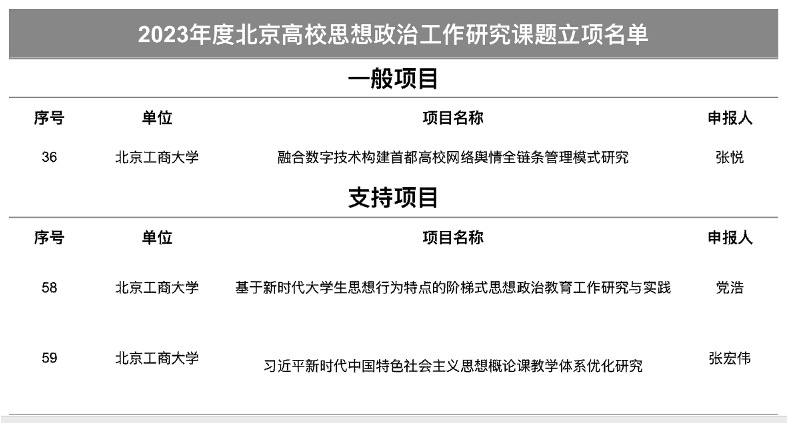 2023年度北京高校思想政治工作研究課題立項(xiàng)名單日前公布,我校3項(xiàng)課題獲批立項(xiàng)。黨委宣傳部張悅申報(bào)的《融合數(shù)字技術(shù)構(gòu)建首都高校網(wǎng)絡(luò)輿情全鏈條管理模式研究》獲批“一般項(xiàng)目”,學(xué)生處黨浩申報(bào)的《基于新時(shí)代大學(xué)生思想行為特點(diǎn)的階梯式思想政治教育工作研究與實(shí)踐》和馬克思主義學(xué)院張宏偉申報(bào)的《習(xí)近平新時(shí)代中國(guó)特色社會(huì)主義思想概論課教學(xué)體系優(yōu)化研究》獲批“支持項(xiàng)目”。