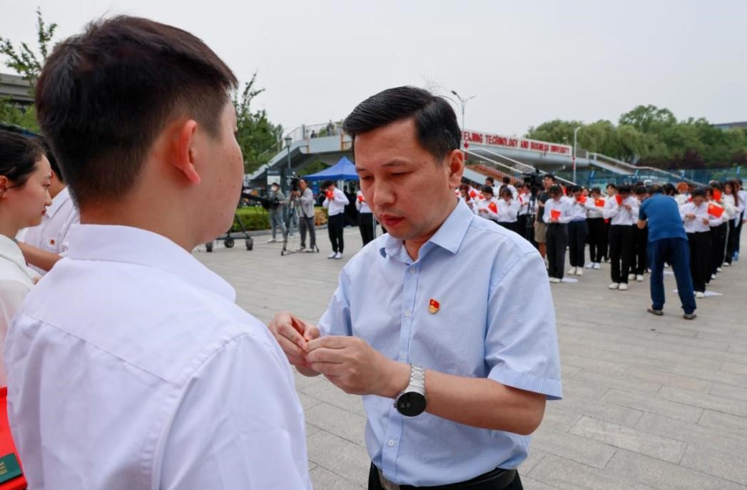 校黨委常委、副校長寇紅江、校團委書記單紫薇、各學院團委書記共同為新發展團員佩戴團徽、頒發團員證。從此刻起,他們肩負起青春使命,將以更高標準要求自己,在中國式現代化建設的偉大實踐中,用實際行動詮釋“共青團員”的光榮稱號,青春向黨,挺膺擔當!