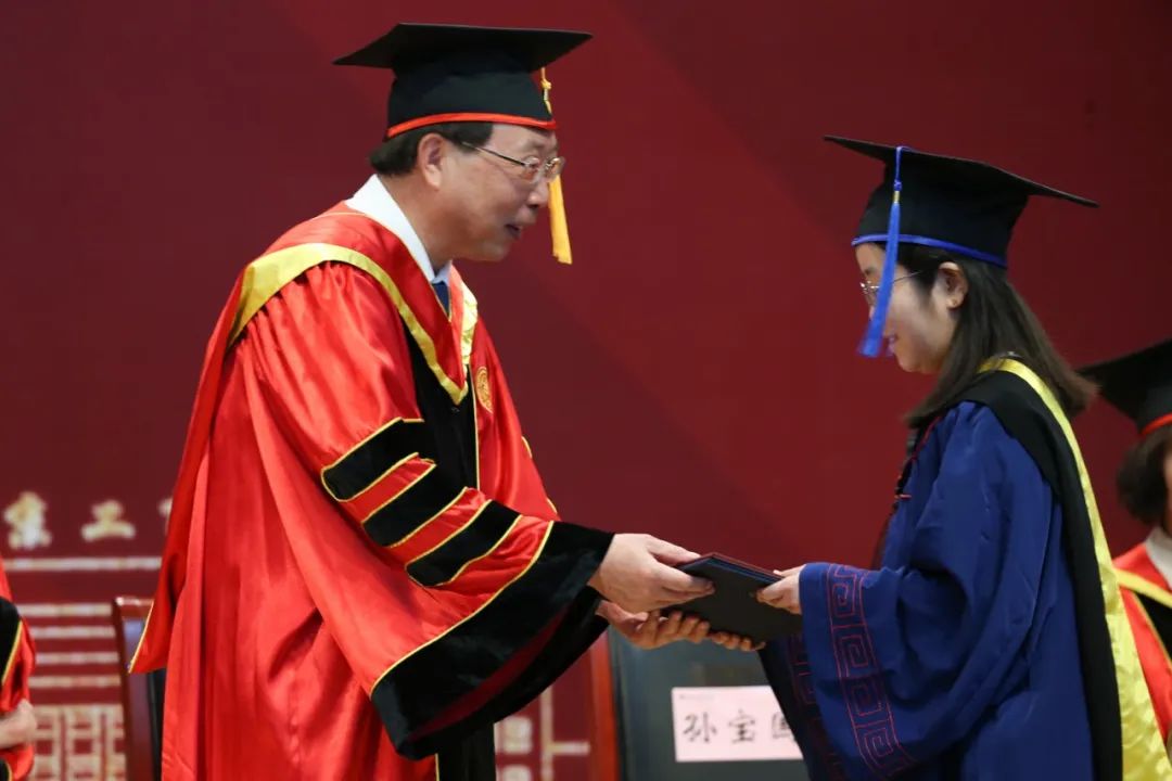 學位授予儀式現場,黨委副書記、校長孫寶國為畢業生代表扶蘇正冠,黨委書記黃先開為畢業生代表頒發畢業證、學位證。