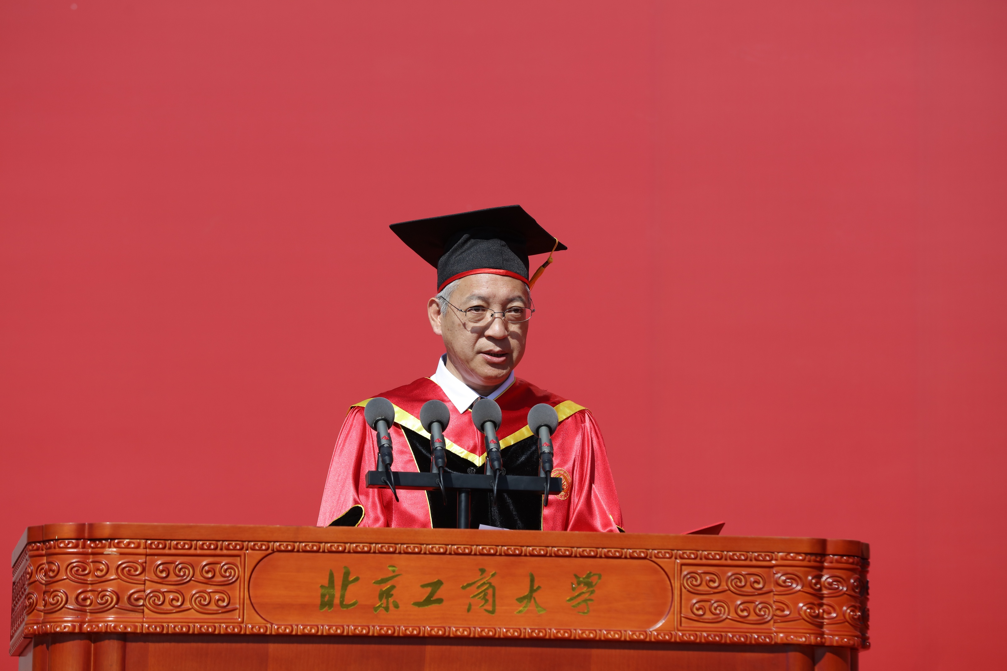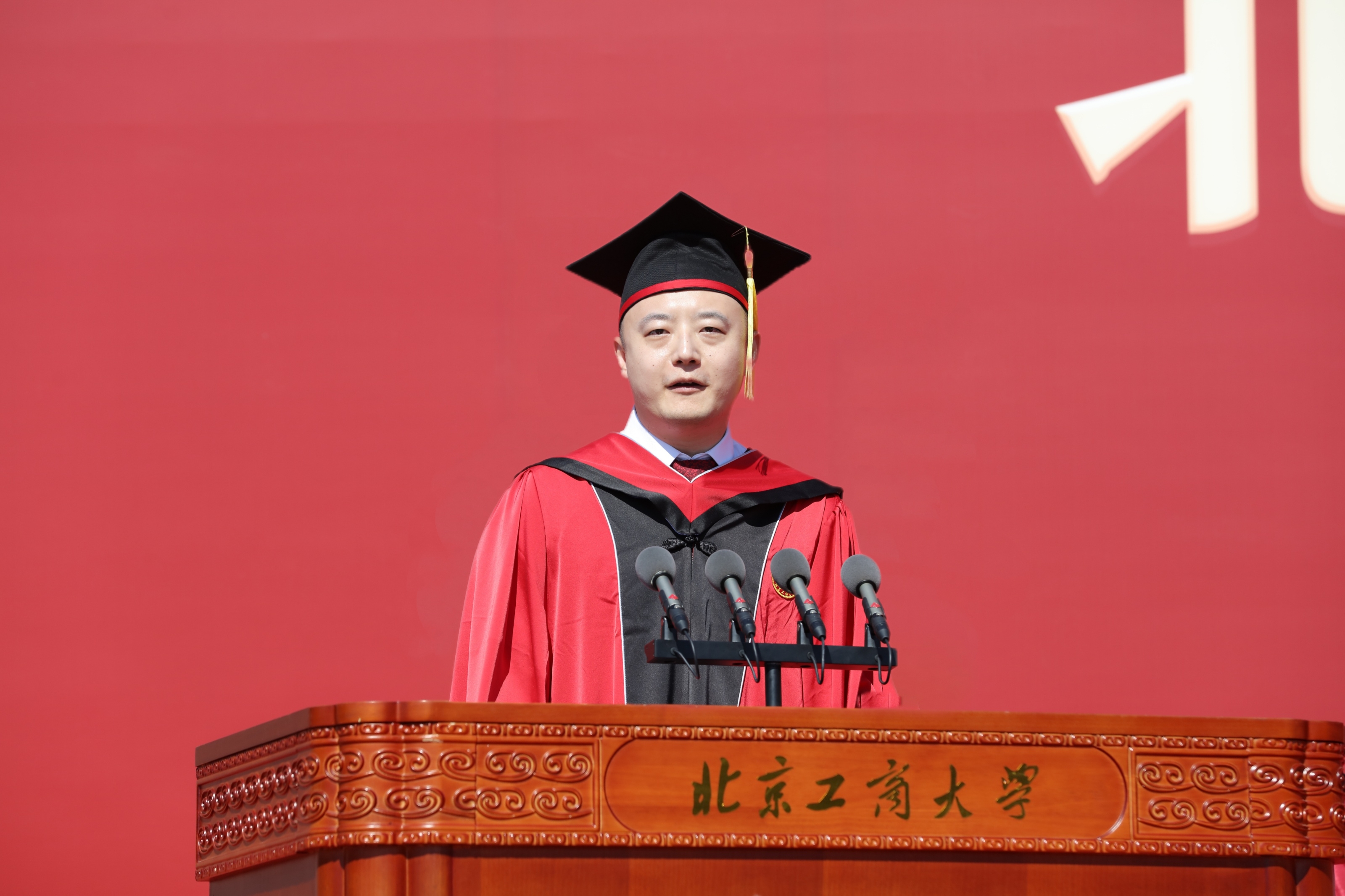 在即將踏上新征程之際,郭建華寄語(yǔ)畢業(yè)生們以“工商一體”的獨(dú)特基因,錨定航向、勇立潮頭:一是在時(shí)代變局中把穩(wěn)“定盤星”,做清醒的破局者。“工商一體化”不僅是北工商人的學(xué)科底色,更是大家破浪前行的獨(dú)特利器。希望大家將工科的系統(tǒng)性思維作為“導(dǎo)航儀”,將商科的動(dòng)態(tài)視野作為“雷達(dá)屏”,既能用科技重構(gòu)世界,更要讓創(chuàng)新成果惠及眾生。二是在創(chuàng)新浪潮中勇當(dāng)“排頭兵”,做硬核的開(kāi)拓者。畢業(yè)不是學(xué)習(xí)的終點(diǎn),而是新的起點(diǎn)。希望大家持續(xù)攻堅(jiān),勇于搶占技術(shù)制高點(diǎn),讓艱深的技術(shù)語(yǔ)言轉(zhuǎn)化為商業(yè)藍(lán)圖,讓硬核的科研成果煥發(fā)市場(chǎng)溫度,在人工智能、工業(yè)互聯(lián)網(wǎng)、數(shù)字孿生等新賽道,開(kāi)辟工商協(xié)同的新范式。三是在跨界融合中構(gòu)筑“生態(tài)圈”,做關(guān)鍵的連接者。要運(yùn)用“工商一體化”的思維方式,在未來(lái)工作與學(xué)習(xí)中深度踐行“技術(shù)研發(fā)→產(chǎn)品創(chuàng)新→商業(yè)模式→產(chǎn)業(yè)生態(tài)”的融合鏈路,用數(shù)據(jù)講述中國(guó)智造的品質(zhì)革命,連接中國(guó)與世界、當(dāng)下與未來(lái)。四是在人生長(zhǎng)跑中鍛造“硬實(shí)力”,做終身的學(xué)習(xí)者。人生不是沖刺跑,而是耐力賽。希望大家構(gòu)建技術(shù)功底、管理智慧與人文素養(yǎng)“三角競(jìng)爭(zhēng)力”,努力用技術(shù)創(chuàng)造美好生活,以商業(yè)傳遞核心價(jià)值,在強(qiáng)國(guó)建設(shè)的星辰大海中,書寫北工商人的壯闊篇章。