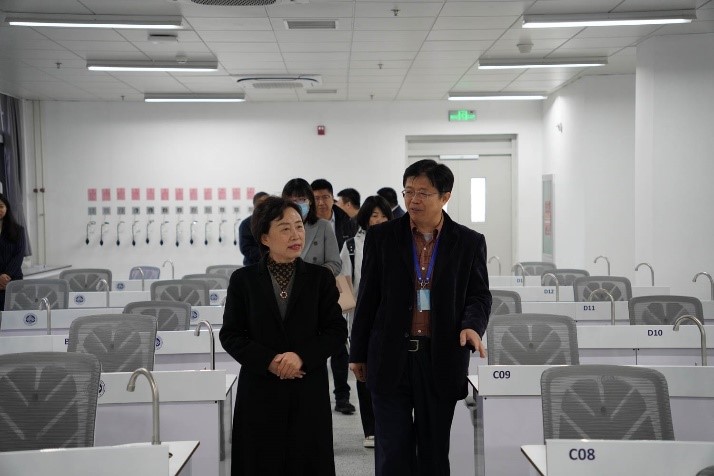 王菁華一行在文二樓、文三樓智慧教室以及數字未來中心現場了解教育教學一體化平臺、知識圖譜子系統、“直錄直播、互聯互通、資源共享”智慧教學環境等數字賦能教育教學建設情況,在中國輕工業釀酒分子工程重點實驗室了解政產學研融合應用情況。在良鄉圖書館和校史館了解館藏資源數字化建設情況,走訪參觀視聽空間、光影空間等個性化服務育人場所。