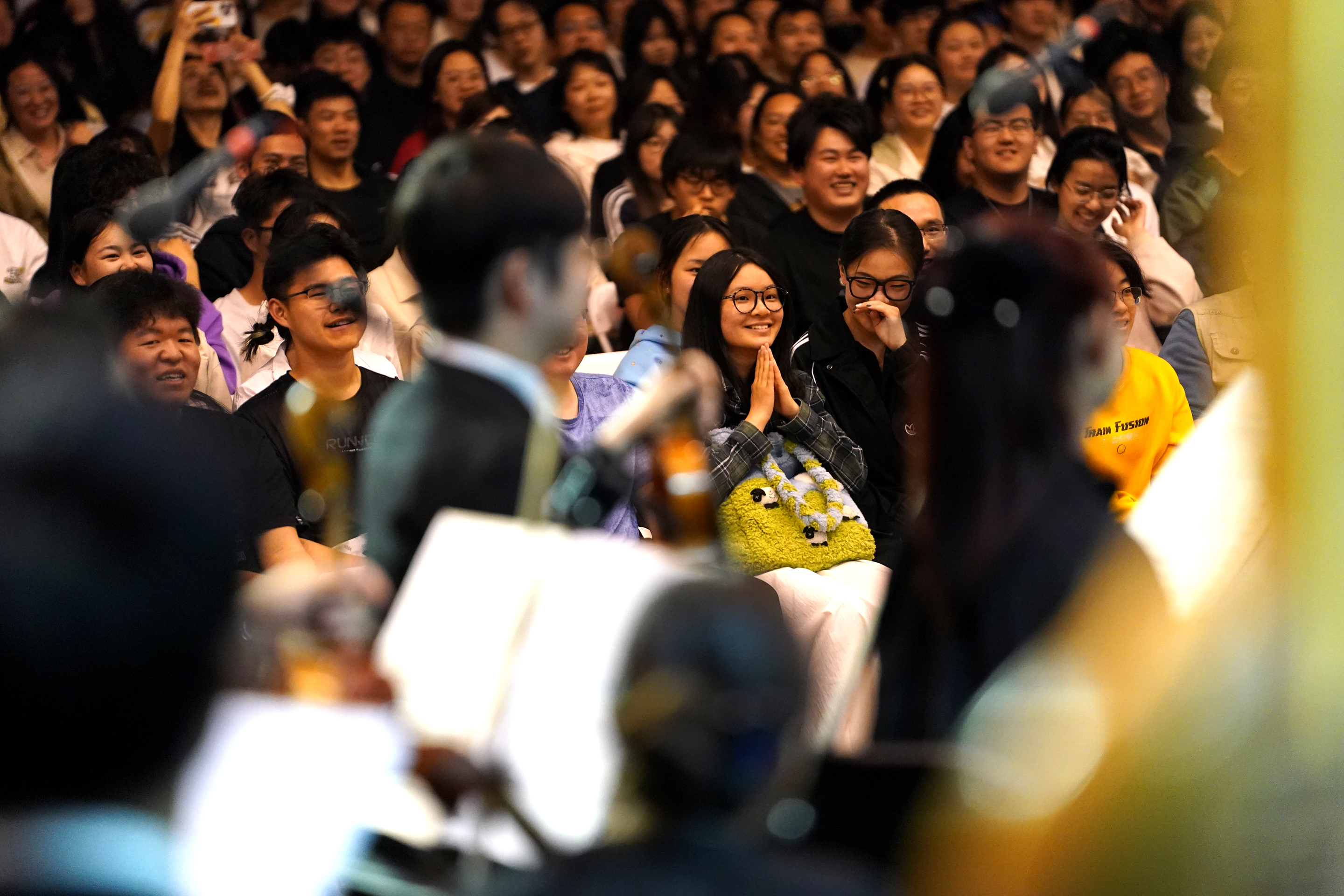 隨著最后一首曲目的結束,全場爆發出了雷鳴般的掌聲。在師生們的掌聲和呼喊聲中,樂團再次返場,獻上《燈火里的中國》《菊花臺》《激情燃燒的歲月》等曲目,現場的氣氛瞬間再次被點燃,將音樂會的氛圍推向了頂點。最終,在《康康舞曲》歡快的旋律中,音樂會圓滿落下帷幕。