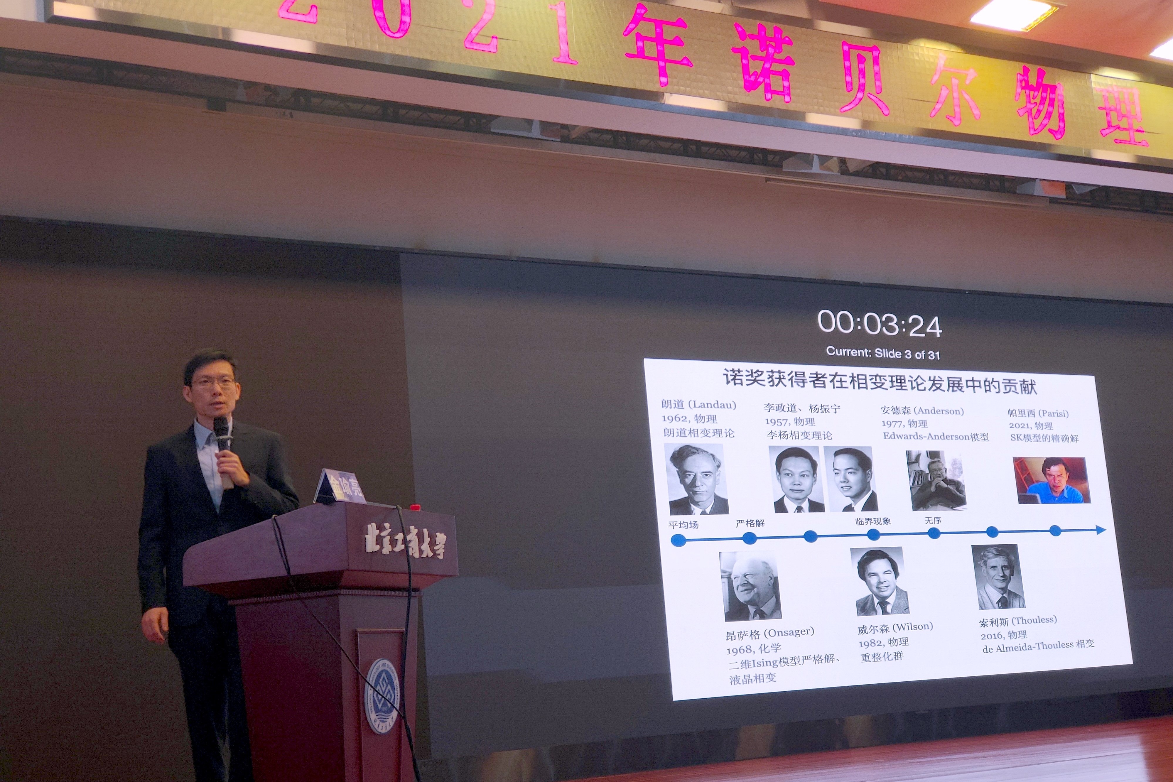 會議邀請了中國科學院理論物理研究所副研究員金瑜亮博士就本年度諾貝爾物理學獎的相關內容進行了“從朗道到帕里西——相變理論的發(fā)展”的主題報告,金瑜亮博士深入淺出地解讀了2021年諾貝爾物理學獎獲得者之一喬治·帕里西(Giorgio Parisi)的主要工作以及復雜系統(tǒng)的統(tǒng)計物理。報告內容引起了與會師生的極大興趣并展開了熱烈討論,線上參會人員通過彈幕也積極參加提問環(huán)節(jié),金瑜亮即時給予回應。