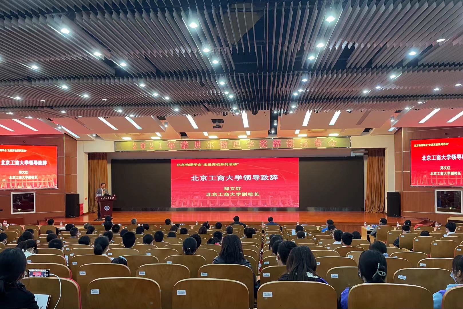 鄭文紅代表學校致歡迎辭,在致辭中回顧了我校的發(fā)展歷程、介紹了學校目前的學科結構和招生規(guī)模。他指出,物理學科作為最重要的基礎學科,為科技革命提供源頭性共給,為建設創(chuàng)新型國家、培養(yǎng)創(chuàng)新型人才提支持。學校通過教學綜合改革,充分發(fā)揮物理學科基礎作用,致力于打造、培養(yǎng)創(chuàng)新人才,為社會發(fā)展作出北工商貢獻。北京物理學會走進北工商,諾貝爾物理學獎解讀報告會在我校舉辦,將為我校廣大師生提供走近前沿科學成果的寶貴機會,對學生科學素養(yǎng)的提高和科學精神的培養(yǎng)有著推動作用,也為展示我校的發(fā)展成果、提升我校影響力提供了契機。
