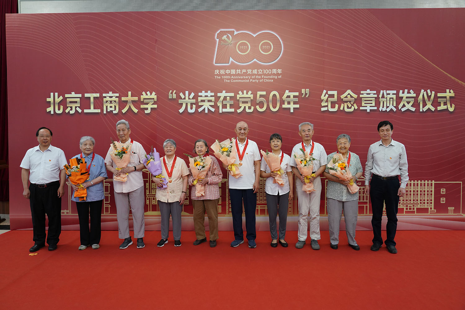 6月29日,北京工商大學“光榮在黨50年”紀念章頒發儀式在阜成路校區隆重舉行。學校黨委書記黃先開、副書記王偉,62名“光榮在黨50年”老黨員代表出席儀式。離退休工作領導小組成員、各支部書記和支部委員代表,以及食品與健康學院師生黨員代表參加儀式。