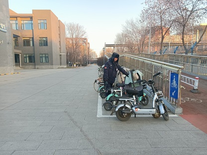 宣傳疏導(dǎo),規(guī)范校園非機動車管理。保衛(wèi)處聯(lián)合學(xué)校青年志愿者協(xié)會組織引導(dǎo)電動自行車和自行車安全秩序,向全體學(xué)生發(fā)起交通安全倡議,在校園22個主要交通樞紐點位安排安保人員和學(xué)生志愿者提醒師生安全騎行、規(guī)范停放。