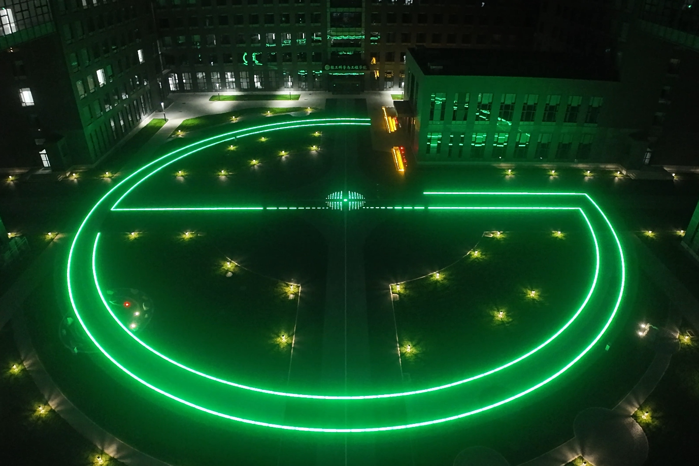 在節(jié)點(diǎn)設(shè)計上,庭院以“工商”的拼音大寫首字母“GS”構(gòu)成燈光景觀,圍繞環(huán)形輔路鋪設(shè)。工商之環(huán)在夜晚指引著道路,讓學(xué)生在科研結(jié)束后孤寂的夜也不再迷茫。