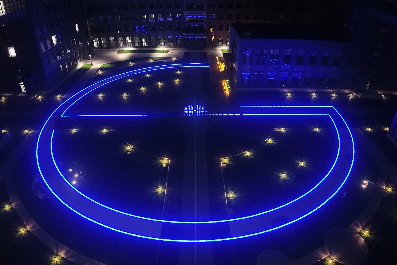 “思想星芒”代表“求真”“求索”,如啟明星一般閃亮。中央地面有一個燈光陣列,燈光陣列寓意著思想的星光閃爍。中央核心有一束光垂直射向天空,象征科學(xué)探索沒有止境。