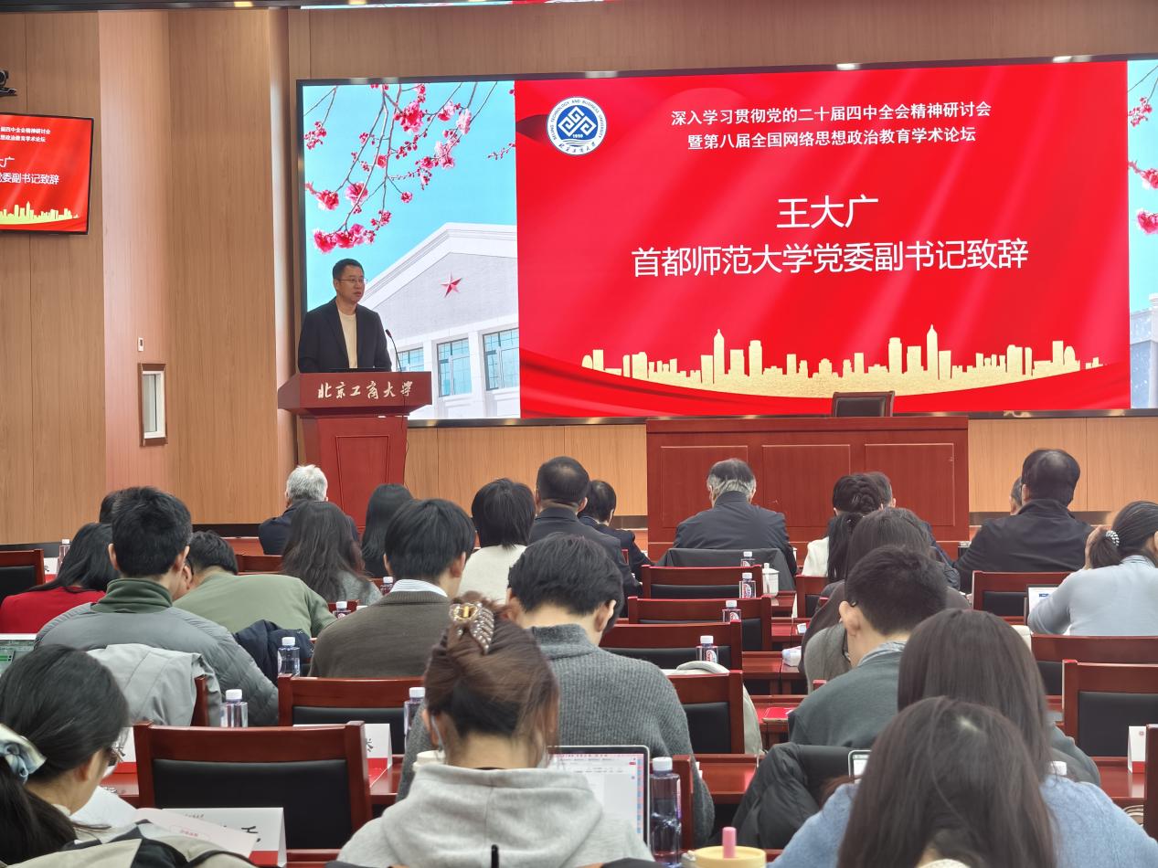 為深入學習貫徹黨的二十屆四中全會精神,進一步推進人工智能時代的網絡思想政治教育高質量發展,12月13日,由北京工商大學馬克思主義學院、北京高校中國特色社會主義理論研究協同創新中心(中國政法大學)、首都師范大學馬克思主義學院聯合主辦的學習貫徹黨的二十屆四中全會精神暨第八屆全國網絡思想政治教育學術論壇在我校阜成路校區舉行。學校黨委副書記李中奇出席論壇并致辭,首都師范大學黨委副書記王大廣、中國政法大學馬克思主義學院院長邰麗華參會并致辭。來自北京大學、清華大學、中國政法大學、首都師范大學、中共中央黨校(國家行政學院)、中國人民大學、中國社科院、重慶大學、華東師范大學、中央財經大學、北京中醫藥大學、中國礦業大學(北京)、中國石油大學(北京)、武漢理工大學、北方工業大學、北京建筑大學、北京市社科院、北京市委黨校等京內外百余所高校、科研院所和雜志社的百余位專家學者和青年學子參會。馬克思主義學院院長趙春麗主持論壇開幕式。