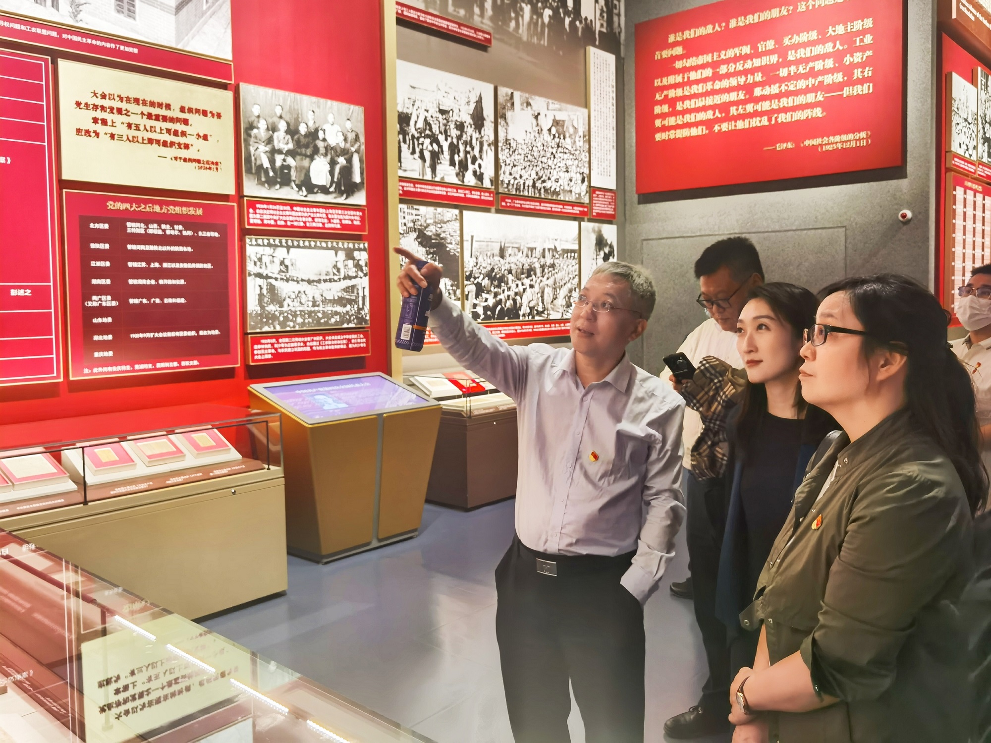 大家認真參觀了“不忘初心、牢記使命”大型主題展覽。展覽共分為“建立中國共產(chǎn)黨奪取新民主主義革命偉大勝利”“成立中華人民共和國進行社會主義革命和建設(shè)”“實行改革開放開創(chuàng)和發(fā)展中國特色社會主義”和“推進中國特色社會主義進入新時代全面建成小康社會開啟全面建設(shè)社會主義現(xiàn)代化國家新征程”四個部分。一幅幅圖片、一件件文物實物,全方位展現(xiàn)了中國共產(chǎn)黨百年奮斗所取得的偉大歷史成就。參觀過程中,大家認真觀看,不時駐足凝望、交流探討,在珍貴的歷史文物、檔案資料、影音圖片及復(fù)原場景中,共同重溫中國共產(chǎn)黨波瀾壯闊、蕩氣回腸的百年歷史,感悟中國共產(chǎn)黨人篳路藍縷、艱苦奮斗的征程。李中奇與老師們?nèi)虆⒂^學習了全部展廳,就可用于思政課教學的重要史實資料與老師們進行了溝通研討。