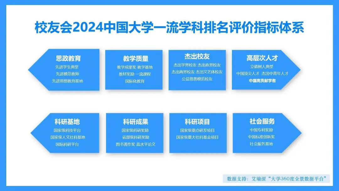 校友會中國大學一流學科排名評價指標體系由思政教育、教學質量、杰出校友、高層次人才、科研基地、科研成果、科研項目和社會服務等八大項一級指標組成,以艾瑞深“大學360度全景數據平臺”為數據支持,圍繞“大平臺、大團隊、大項目、大成果、大校友”對中國大學學科發展水平展開評價,涵蓋200多項體現中國大學學科建設水平的核心評價指標,指標數據全部來源于教育部、科技部、人事部、第三方機構和高校等對社會公開的權威數據與客觀數據。引導中國大學扎根中國大地辦教育,推進中國大學深化實施有組織的科研,解決卡脖子問題,提高服務國家地方經濟社會發展的能力與貢獻,助力中國大學加快“雙一流”學科和省級高水平學科建設,增強學科核心競爭力與學科建設水平。