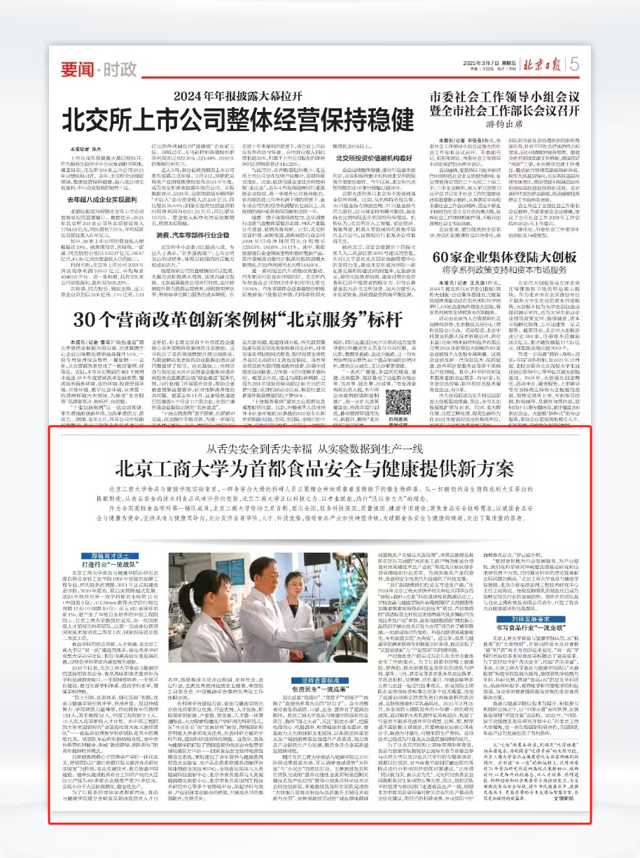 3月7日,《北京日報(bào)》第五版要聞·時(shí)政版以《從舌尖安全到舌尖幸福 從實(shí)驗(yàn)數(shù)據(jù)到生產(chǎn)一線,北京工商大學(xué)為首都食品安全與健康提供新方案》為題,報(bào)道了我校食品與健康學(xué)院聚焦食品安全戰(zhàn)略需求,以賦能食品安全與健康為使命,堅(jiān)持風(fēng)味與健康雙導(dǎo)向,為首都食品安全與健康提供新方案。