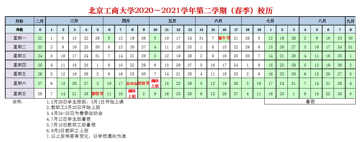 2020-2021學年第二學期(春季)校歷