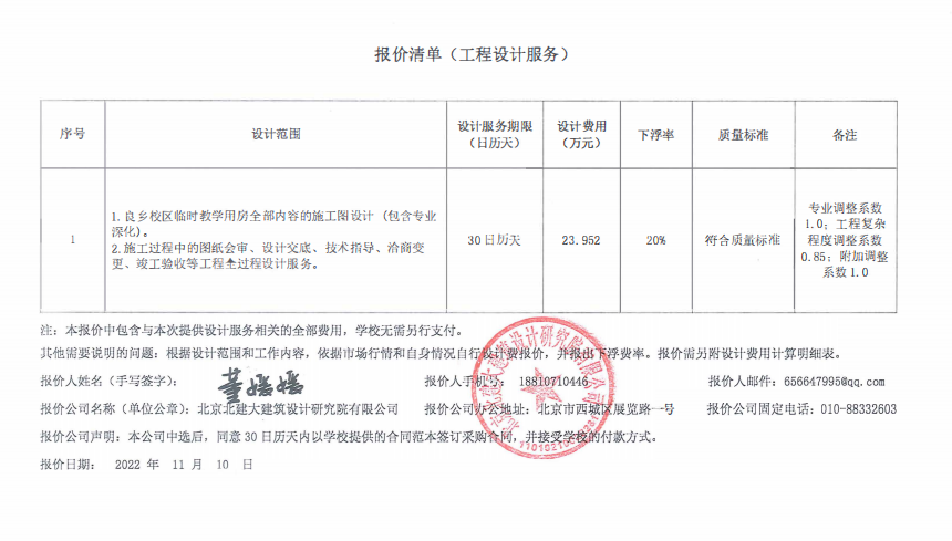 為推進良鄉校區更新完善教學辦公條件工作,擬對良鄉校區臨時教學用房進行設計。通過市場調研發出詢價,有四家公司提供了報價,經校園建設處處務會研究,綜合考慮性價比、單位資質和服務業績,擬選定北京北建大建筑設計研究院有限公司進行設計服務。