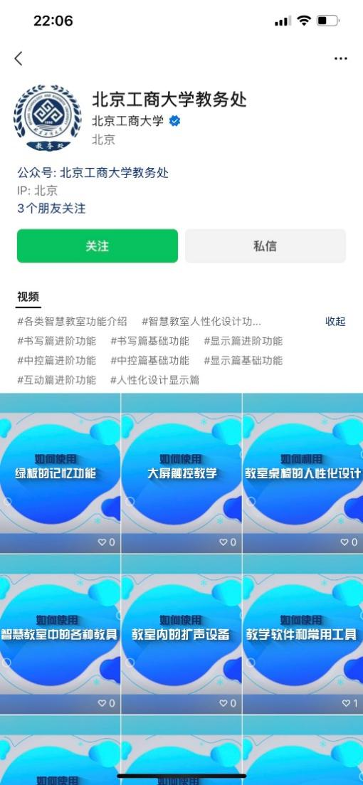 在“北京工商大學教務處”公眾號上,可以觀看智慧教室各種功能講解短視頻,教師可隨時隨地點擊觀看,方便快捷。視頻是由我校多位教師共同拍攝,身臨其境地體驗了智慧教學的應用方法,并站在專任教師的角度講解了智慧教室使用方法。
