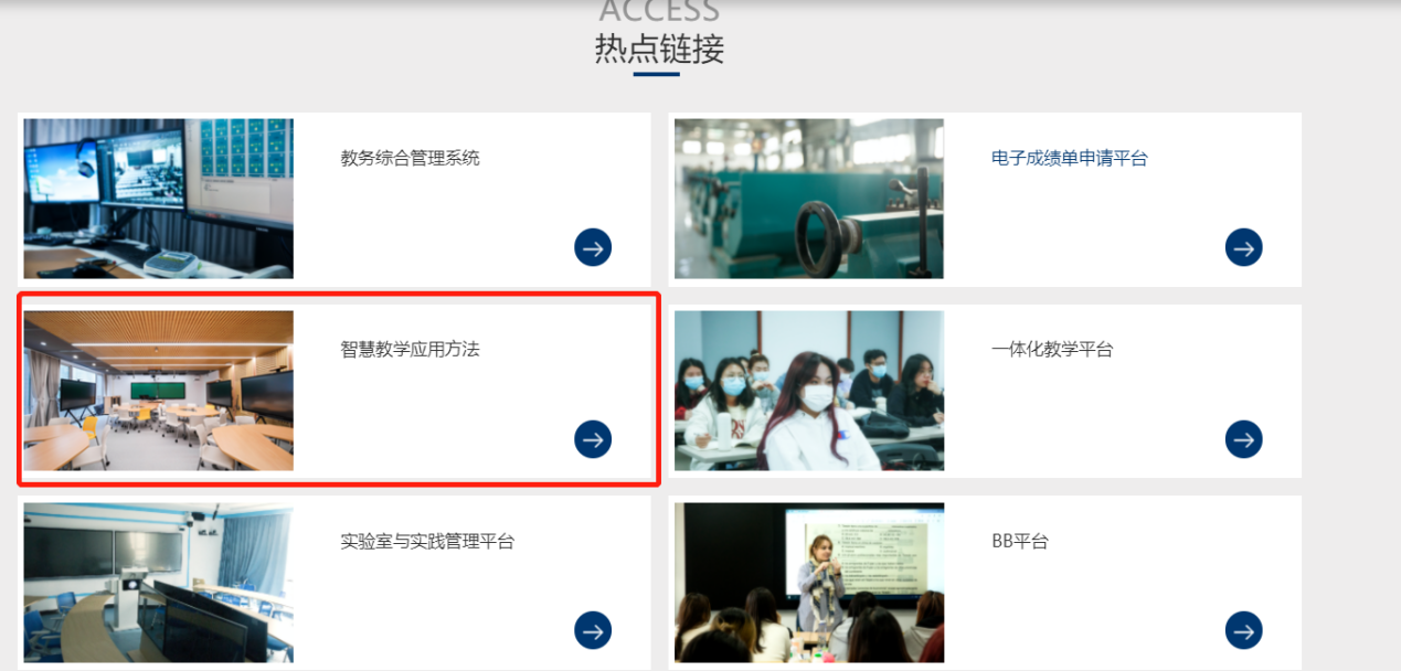 專題網站登錄方式:打開“教務處網站”(https://jwc.btbu.edu.cn),找到“熱點鏈接”,點擊“智慧教學應用方法”。