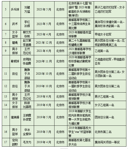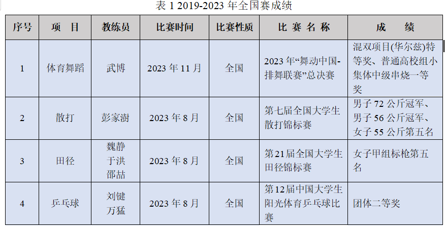 在近五年中,學校體育運動隊在市級以上比賽中取得顯著成績,有122人次取得體育類全國比賽前八名成績,2215人次取得省部級前八名成績。其中,榮獲第一名881人次、第二名406人次、第三名344人次。田徑隊、游泳隊、男子排球隊、女子排球隊參加全國普通學生組比賽,均獲得了好成績。乒乓球隊在2019年獲得第十屆中國大學生陽光體育乒乓球比賽混合團體第一的優異成績,毽球隊在2021年舉行的第十屆全國大學生毽球錦標賽中獲得團體總分第二名的優異成績,散打隊在2023年第7屆中國大學生武術散打錦標賽中取得兩金的突破性成績。這些成績不僅展示了我校體育競技的實力,也反映了校園文化的活力和學生全面發展的成果。